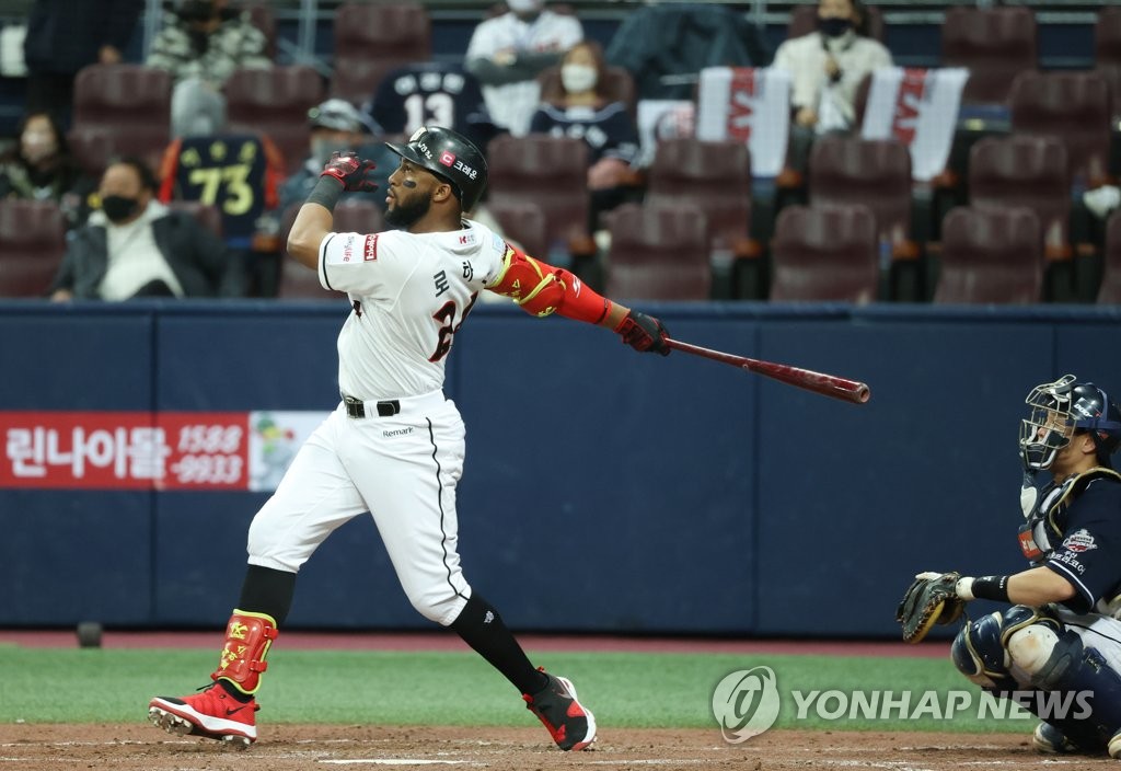 | ▲ In this file photo from Nov. 10, 2020, Mel Rojas Jr. of the KT Wiz follows through on his solo home run against the Doosan Bears in the bottom of the third inning of Game 2 of the second-round series in the Korea Baseball Organization postseason at Gocheok Sky Dome in Seoul. (Yonhap) |