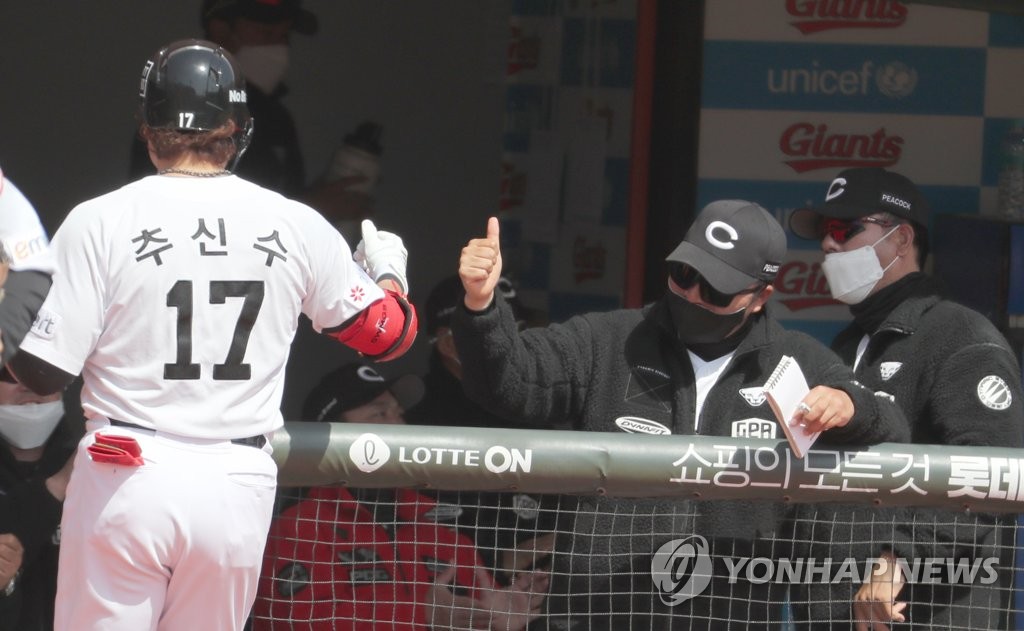 | ▲ Choo Shin-soo of the SSG Landers (L) is greeted by his coaches after the end of the top of the third inning of a Korea Baseball Organization preseason game against the Lotte Giants at Sajik Stadium in Busan, 450 kilometers southeast of Seoul, on March 23, 2021. (Yonhap) |