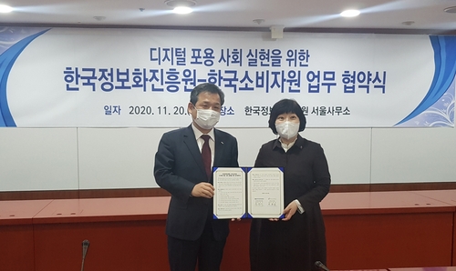 ▲ 한국소비자원은 20일 한국정보화진흥원과 디지털 소비자 교육을 위한 업무 협약을 맺었다. 양 기관은 소비자의 디지털 역량 강화를 위한 프로그램 마련과 교육 콘텐츠 개발 등에 협력하기로 했다. 소비자원은 고령자, 농·산·어촌 주민 등 디지털 소외 계층의 피해 예방 프로그램을 추진할 계획이다. (서울=연합뉴스)