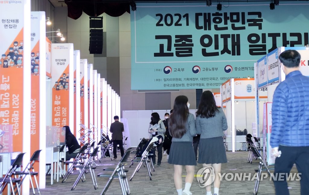 | ▲ This photo taken on March 24, 2021, shows high school students looking around a job fair held at the KINTEX exhibition hall in Goyang, just north of Seoul, despite the COVID-19 pandemic. (Yonhap) |