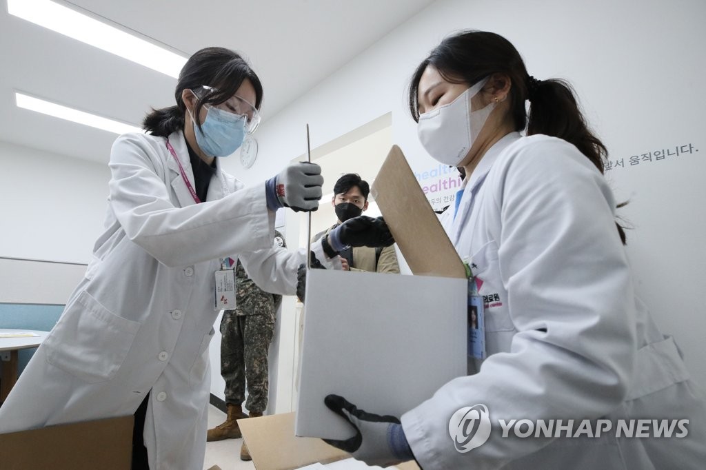| ▲ Medical staff at a coronavirus vaccination center in Suwon, just south of Seoul, check Pfizer COVID-19 vaccines for the elderly aged 75 or older on March 24, 2021. (Yonhap) |
