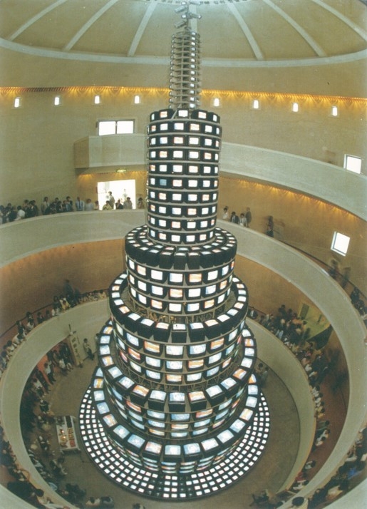 The six-tier conical tower consists of 1,003 cathode-ray tube (CRT) monitors emitting a cascade of light and colorful images to symbolize the immensity of mass communication and information dissemination not long after the mass distribution of the first color television.