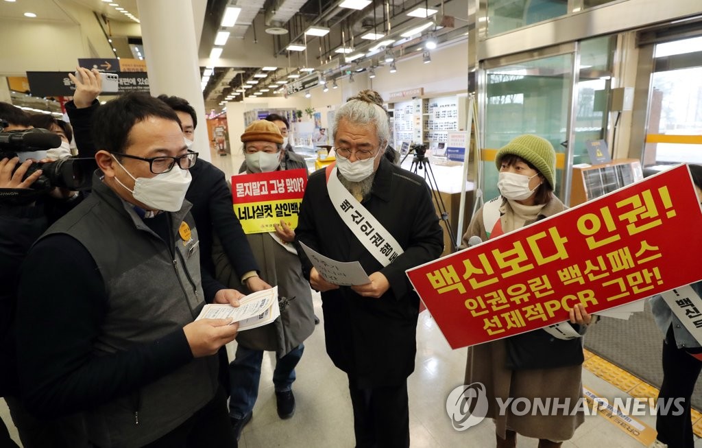 | ▲ 청주 시민단체 대형마트 백신패스 적용 '반대' (청주=연합뉴스) 천경환 기자 = 코로나19 백신 접종에 반대하는 시민들이 모인 '백신인권행동'이 10일 오후 충북 청주시의 한 대형마트 앞에서 백신패스 반대 시위를 하고 있다. 2022.1.10 kw@yna.co.kr |