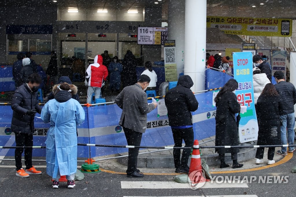 | ▲ People wait to get tested for COVID-19 at a testing station in a snowy Gwangju, 329 kilometers southwest of Seoul, on Dec. 17, 2021. (Yonhap) |