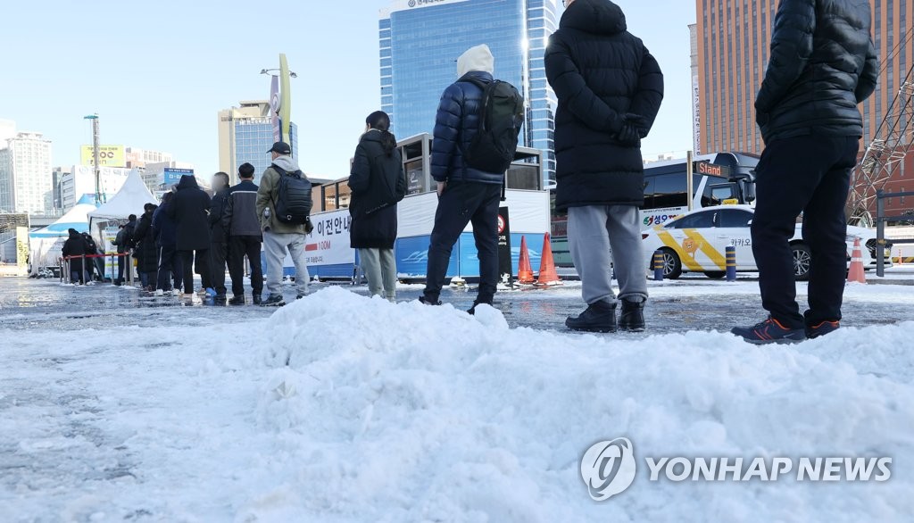 | ▲ People in thick winter clothes wait in line for coronavirus tests at a pop-up screening clinic in the southwestern city of Gwangju on Dec. 17, 2021, as snow falls, with the mercury dipping to a low of 1 C. South Korea's new coronavirus cases stayed above 7,400 for the third consecutive day, with the country set to restore tight social distancing and other virus curbs to contain the fast spread of the virus. (Yonhap) |