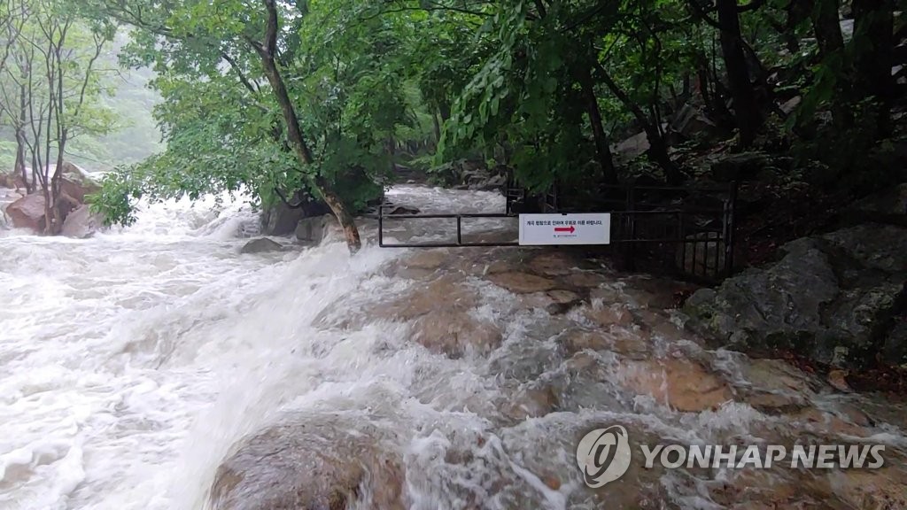 | ▲ 호우경보 설악산 탐방로 전 구간 통제 (속초=연합뉴스) 지난 5일부터 6일까지 100㎜가 넘는 비가 쏟아진 설악산에 급류가 흐르고 있다. 설악산국립공원사무소는 이날 오전 6시부터 탐방객 안전을 위해 탐방로 전 구간을 통제했다. 2022.6.6 [설악산국립공원사무소 제공 영상 갈무리. 재판매 및 DB 금지] conanys@yna.co.kr |