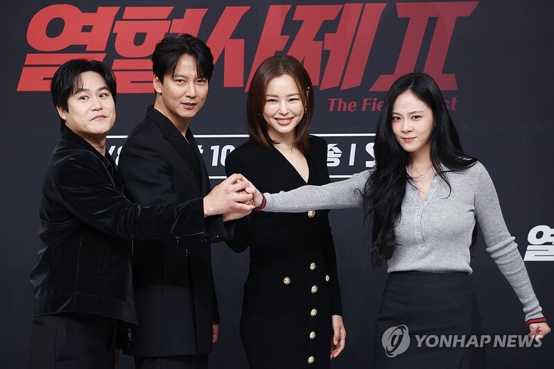 | ▲ 믿고 보는 배우들이 의기투합한 '열혈사제2' (서울=연합뉴스) 진연수 기자 = 8일 오후 서울 양천구 SBS 사옥에서 열린 SBS 새 금토드라마 '열혈사제' 시즌2 제작발표회에서 출연 배우들이 포즈를 취하고 있다. 왼쪽부터 김성균, 김남길, 이하늬, 김형서(비비). 2024.11.8 jin90@yna.co.kr |