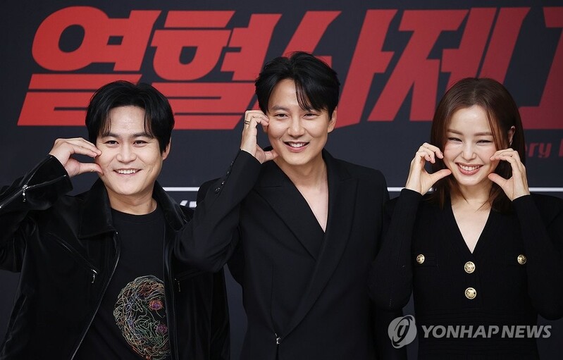 | ▲ 이하늬·김남길·김성균의 볼하트 (서울=연합뉴스) 진연수 기자 = 배우 이하늬(오른쪽부터), 김남길, 김성균이 8일 오후 서울 양천구 SBS 사옥에서 열린 SBS 새 금토드라마 '열혈사제' 시즌2 제작발표회에서 포즈를 취하고 있다. 2024.11.8 jin90@yna.co.kr |