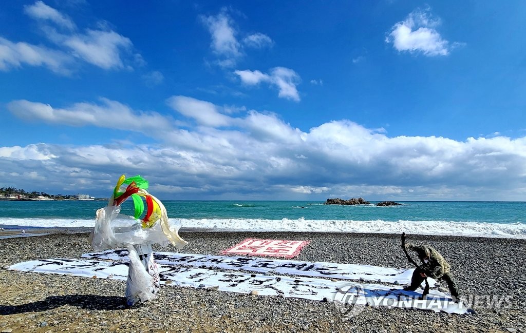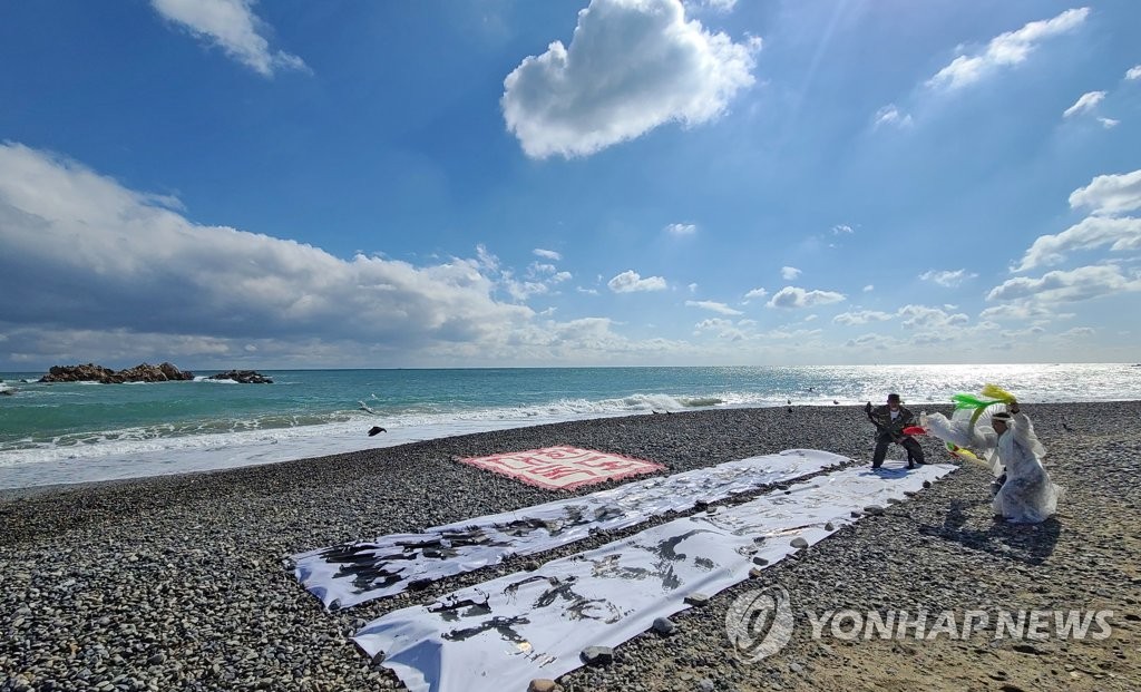 | ▲ 멀리 떨어진 독도까지 전해지기를 (경주=연합뉴스) 22일 경북 경주시 문무대왕면 봉길리 문무대왕릉 앞 봉길해수욕장에서 서예가 김동욱 씨와 이희숙 한국고살풀이춤보존회장이 독도의 날(10월 25일)을 앞두고 서예 퍼포먼스를 하고 있다. 2021.10.22 [김동욱 씨 제공. 재판매 및 DB 금지] sds123@yna.co.kr |