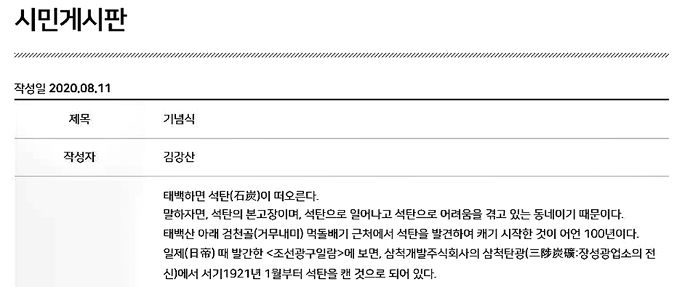 ▲ 태백시청 홈페이지 시민게시판 [캡처 배연호]