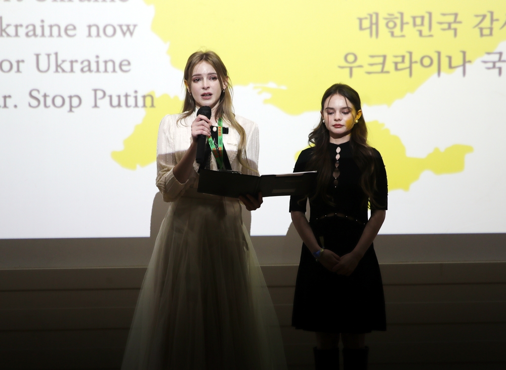 이날 성명서 낭독에는 전주국제영화제에 출품된 코리안시네마 단편 '선산'의 우크라이나 국적 올레나 시도르추크 배우도 함께했다.