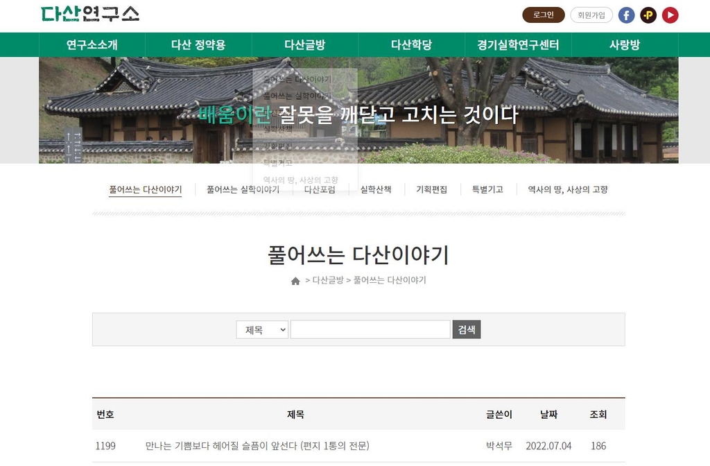 | ▲ 다산 연구소 홈페이지 [홈페이지 캡처. 재판매 및 DB 금지] |