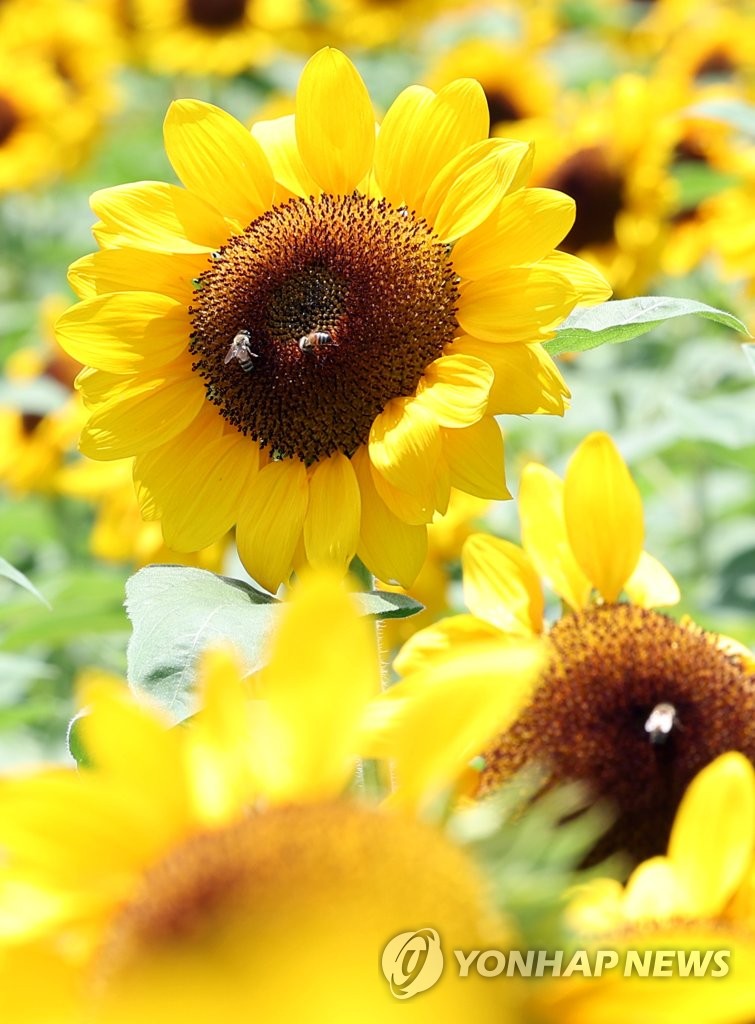 (함안=연합뉴스) 김동민 기자 = 6일 오후 경남 함안군 법수면 강주마을에 해바라기가 활짝 펴 시선을 끌고 있다.