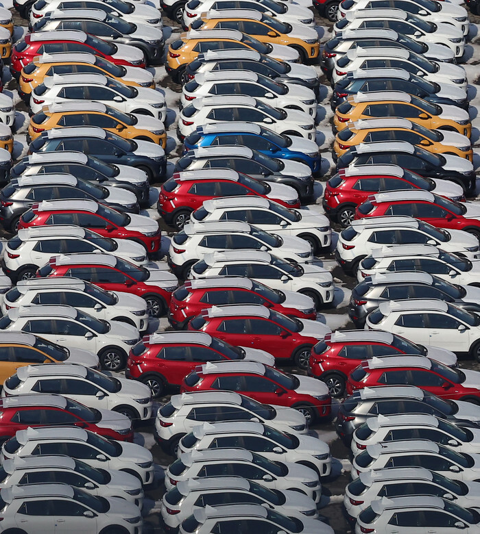 Cars waiting for shipment are packed at a port in Pyeongtaek, south of Seoul, on Feb. 11, 2025. U.S. President Donald Trump announced plans the previous day to impose 25 percent tariffs on all steel and aluminum imports coming into the United States "without exceptions or exemptions," raising concerns over its ramifications on South Korean and other exporters. (Yonhap)