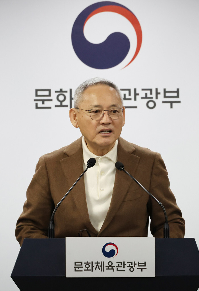 Culture Minister Yu In-chon speaks during a press conference at the government complex in Seoul on March 6, 2025, to announce his ministry's mid-and-long-term vision for culture, sports and tourism policies. The culture ministry said it will push to relocate national arts organizations from Seoul to regional areas to narrow the cultural divide between them while expanding creative infrastructure nationwide. (Yonhap)