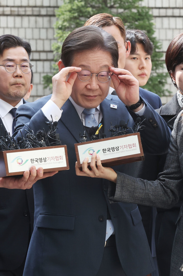 Lee Jae-myung, leader of the main opposition Democratic Party, adjusts his glasses as he appears at the Seoul High Court in the capital on March 26, 2025, to attend a verdict hearing of his appellate trial over charges he lied as a presidential candidate during the 2022 election. (Yonhap)