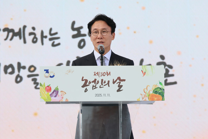 Prime Minister Kim Min-seok delivers a congratulatory speech during a ceremony to mark Farmers Day in Wonju, the capital of South Korea's northeast province of Gangwon, on Nov. 11, 2025. (Yonhap)