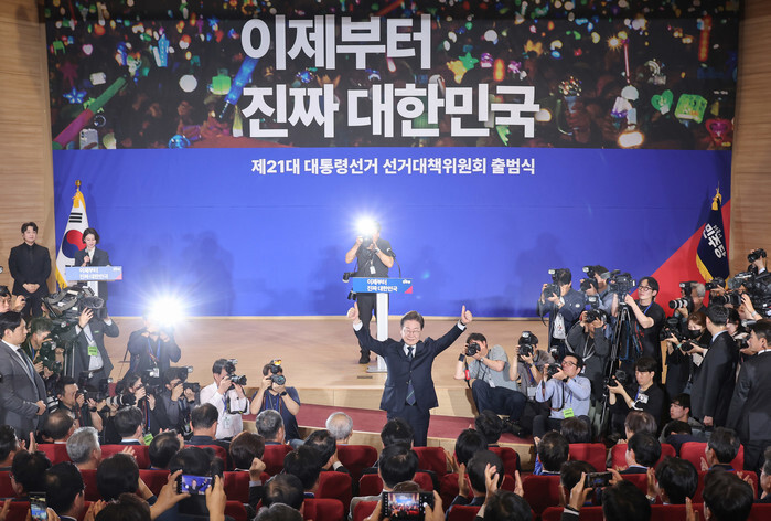 Lee Jae-myung (C), the liberal Democratic Party's presidential candidate, gives two thumbs-up during a ceremony at the National Assembly in Seoul on April 30, 2025, to launch the party's election committee that aims to woo both liberal and conservative voters ahead of the June 3 presidential election. (Yonhap)