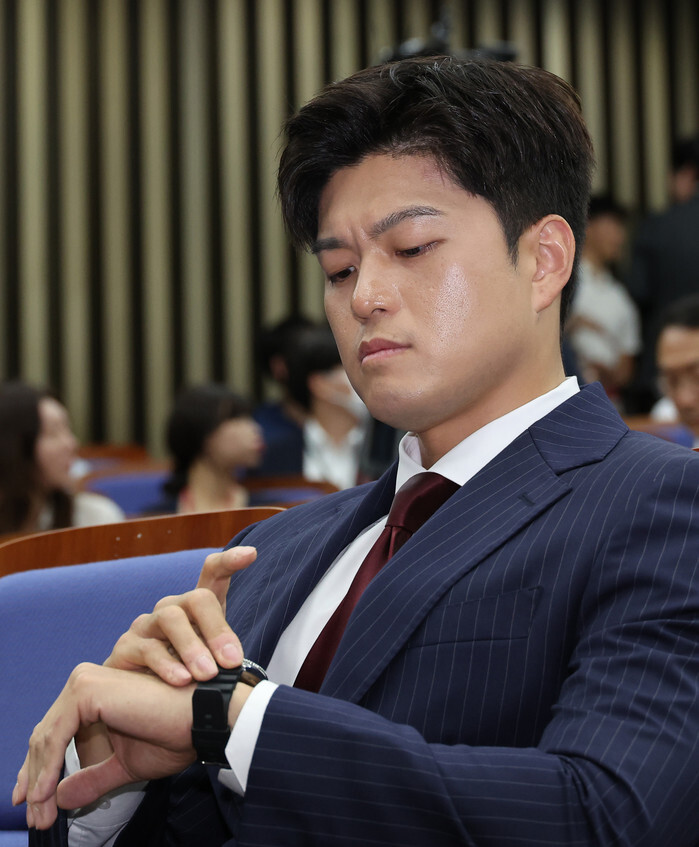 Kim Yong-tae, leader of the opposition People Power Party's emergency leadership committee, looks at his watch during a meeting of the party's lawmakers at the National Assembly in Seoul on June 9, 2025. (Yonhap)