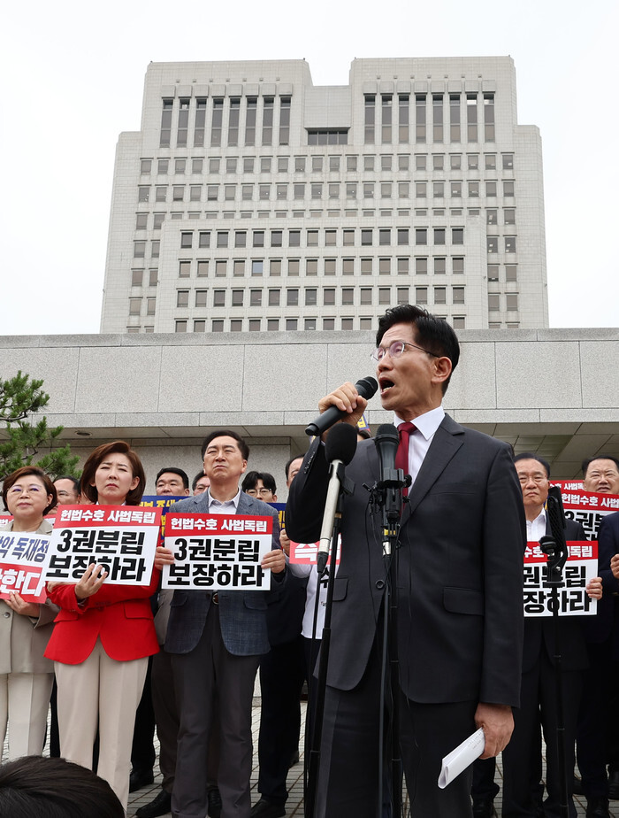 Kim Moon-soo (front), the presidential candidate of the conservative People Power Party, speaks during a rally in front of the Supreme Court in Seoul on May 15, 2025, to accuse the Democratic Party (DP) of what Kim called the DP's attempt to pressure the top court in favor of its presidential candidate, Lee Jae-myung. (Yonhap)