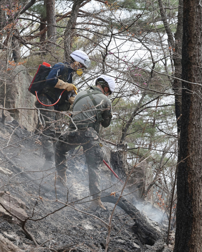 Soldiers extinguish hot spots on a mountain ravaged by a wildfire in the southeastern city of Ulsan on March 24, 2025, two days after it broke out. (Yonhap)