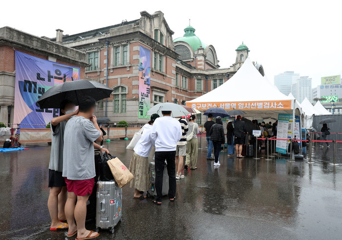 People wait to take COVID-19 tests at a makeshift clinic set up near Seoul Station in central Seoul as Typhoon Hinnamnor moves northward toward South Korea on Sept. 4, 2022. (Yonhap)