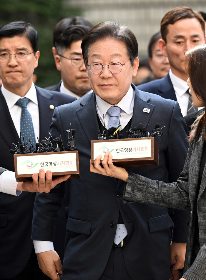 Lee Jae-myung (C), leader of the main opposition Democratic Party, appears at the Seoul High Court in the capital on March 26, 2025, to attend a verdict hearing of his appellate trial over charges he lied as a presidential candidate during the 2022 election. (Yonhap)