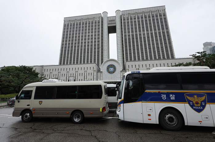 Police buses are parked at the Seoul Central District Court in the capital on July 18, 2025, where jailed former President Yoon Suk Yeol attended a hearing on the legality of his arrest amid a special counsel probe into his botched attempt to impose martial law. (Yonhap)