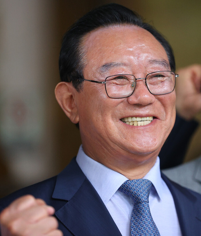 Former Ulsan Mayor Song Cheol-ho celebrates at the Supreme Court in Seoul on Aug. 14, 2025, after the top court upheld a lower court's acquittal of him and Hwang Un-ha, a lawmaker of the Rebuilding Korea Party, who were charged with election interference related to the southeastern city's mayoral election in 2018. (Yonhap)