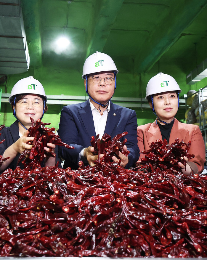 Song Eon-seog (C), leader of the main opposition People Power Party's emergency leadership committee, looks at dried hot peppers in stock during a visit to a reserve base of the state-run Korea Agro-Fisheries & Food Trade Corp. in Icheon, south of Seoul, on July 25, 2025, amid rises in prices of agricultural products caused by a heat wave and torrential rains gripping the country. (Yonhap)