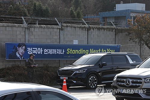 | ▲ A motorcade carrying two members of K-pop supergroup BTS -- Jimin and Jungkook -- enters the Army's 5th Infantry Division's boot camp in Yeoncheon, 60 kilometers north of Seoul, on Dec. 12, 2023, during their joint entry into the camp to fulfill their obligatory military service. (Yonhap) |