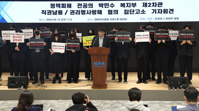 The representatives of trainee doctors hold a news conference at the Korean Medical School in Seoul on April 15, 2024, announcing their filing of a complaint against Vice Health Minister Park Min-soo on charges of abusing power in the pursuit of the government's plan to augment the number of medical students. (Yonhap)