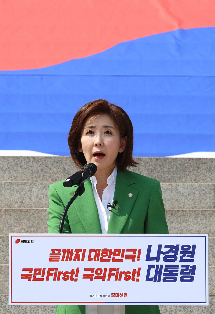 Na Kyung-won, a lawmaker of the conservative People Power Party, attends a press conference at the National Assembly in Seoul on April 11, 2025, to announce her presidential candidacy in the party's nomination race ahead of the June 3 election, triggered by the ouster of former President Yoon Suk Yeol. (Yonhap)