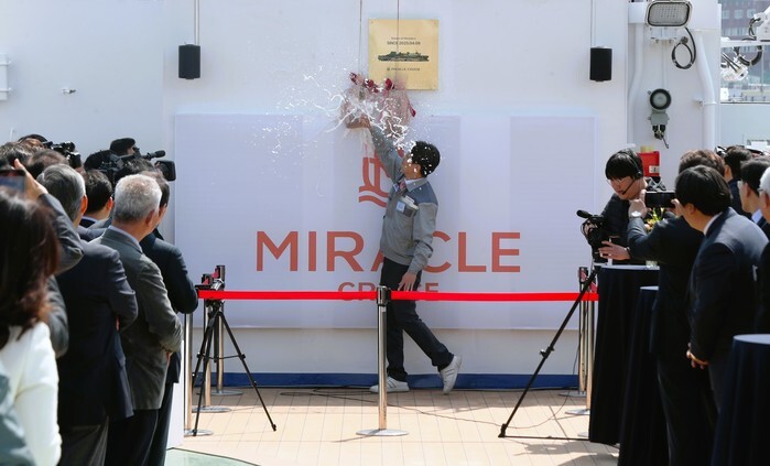 The traditional breaking of a bottle of champagne takes place during the christening ceremony of the cruise ferry Panstar Miracle at Daesun Shipbuilding and Engineering Co.'s shipyard in the southeastern port city of Busan on April 9, 2025. The 22,000-ton luxury ferry, the first South Korean-made cruise ship, is set to service the Busan-Osaka route starting April 13, coinciding with the opening of the World Expo in the Japanese city. (Yonhap)