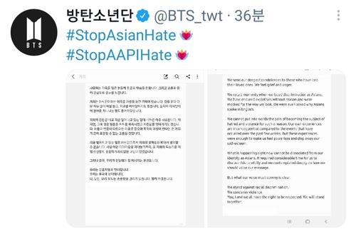 SEOUL, March 30 (Yonhap) -- Joining the widening "Stop Asian Hate" movement, triggered by the recent deadly shootings in Atlanta, K-pop boy band BTS condemned racial discrimination and violence in a resolute Twitter message Tuesday.