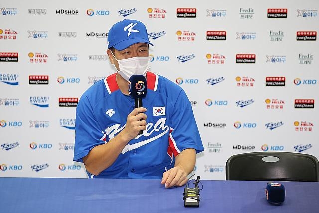 | ▲ Kang Min-ho, catcher on the South Korean Olympic baseball team, speaks at a press conference at Gocheok Sky Dome in Seoul on July 18, 2021, in this photo provided by the Korea Baseball Organization. (PHOTO NOT FOR SALE) (Yonhap) |