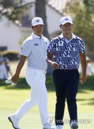 | ▲ 동반 플레이를 펼치며 담소하는 김주형(왼쪽)과 김시우. [AP=연합뉴스] |