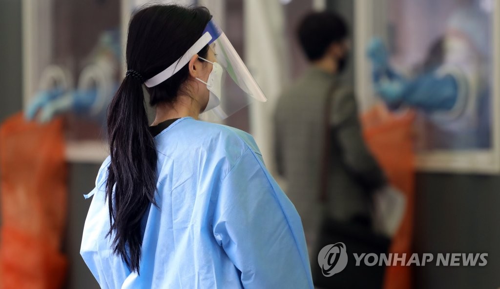 | ▲ A health worker in a protective suit guides citizens at a makeshift virus clinic in Seoul on April 23, 2021. (Yonhap) |