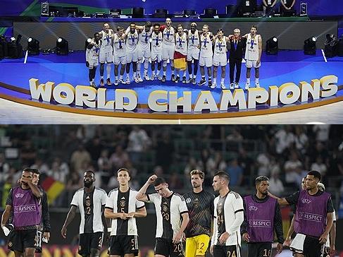 | ▲ 기뻐하는 독일 농구 대표팀(위)과 실망한 축구대표팀(아래) [AP=연합뉴스] |
