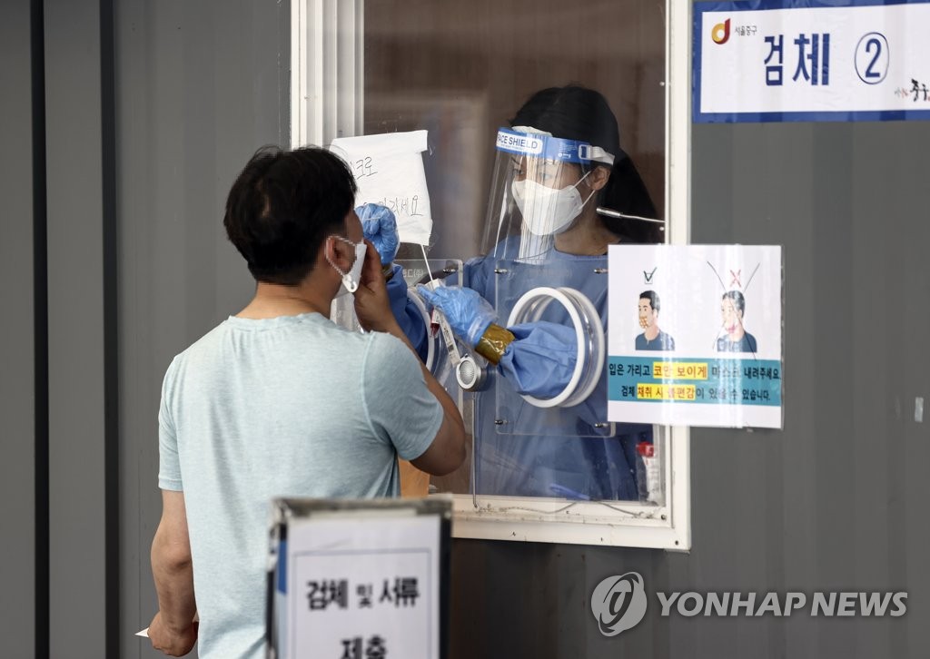 | ▲ A medical worker takes a swab from a man to test for COVID-19 at a testing center at Seoul Station in central Seoul on July 1, 2021. (Yonhap) |