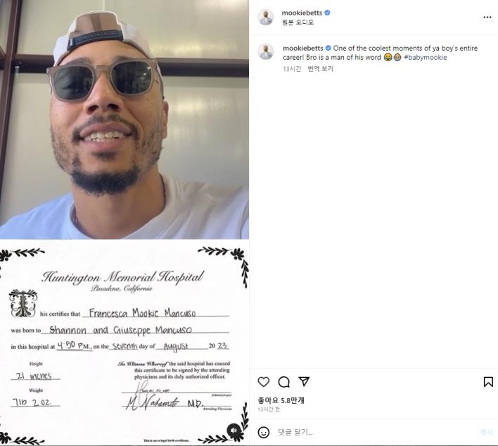 만쿠소 씨는 베츠에게 "이번 타석에서 홈런을 치면 곧 태어나는 내 딸아이의 중간 이름을 무키라고 짓겠다"라고 웃으며 말했다.