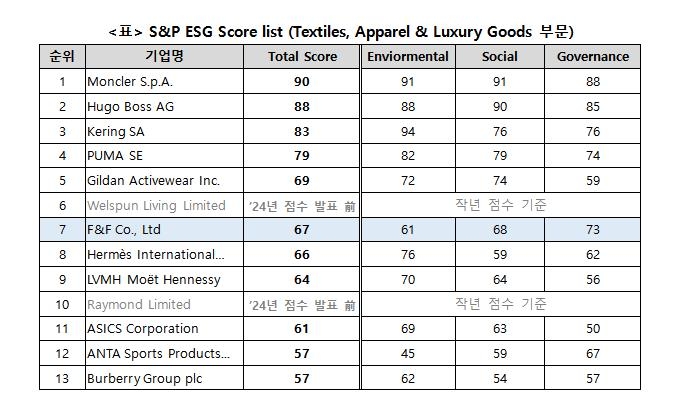 F&F, S&P 글로벌 ESG 평가서 의류·럭셔리부문 상위 3% 들어