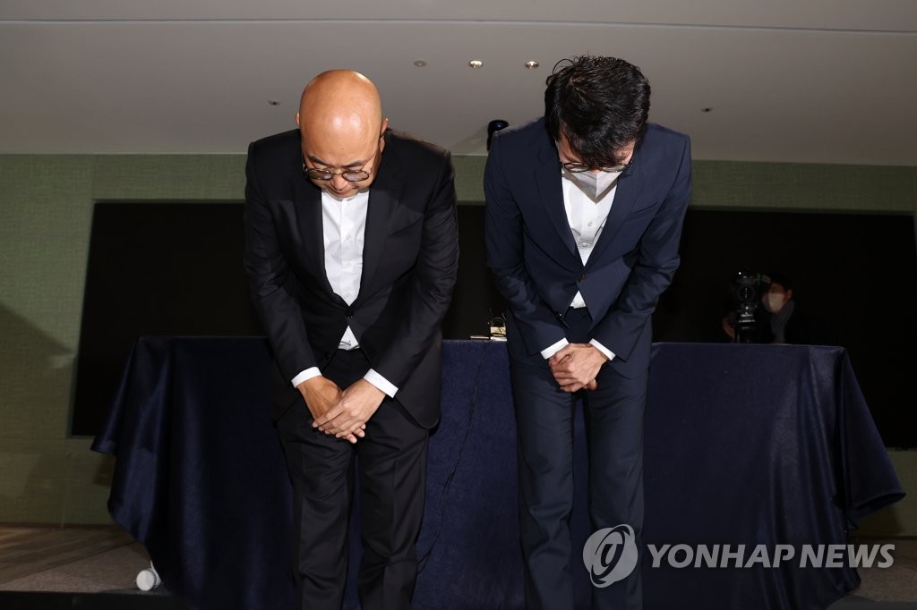 | ▲ Co-CEOs of Kakao Corp. Namkoong Whon (L) and Hong Eun-taek bow their heads during a press conference at Kakao's office building in Pangyo, just south of Seoul, on Oct. 19, 2022. (Yonhap) |
