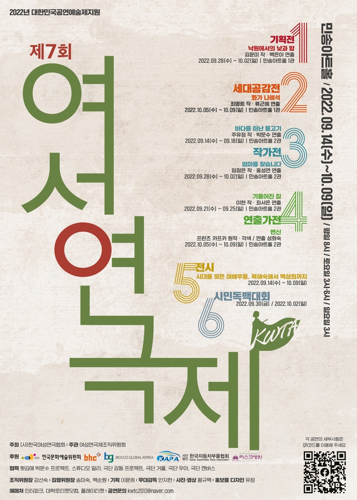 ▲ 제7회 여성연극제 = 한국여성연극협회가 주최하는 '제7회 여성연극제'가 9월 14일부터 10월 9일까지 서울 대학로 민송아트홀 1,2관에서 열린다.