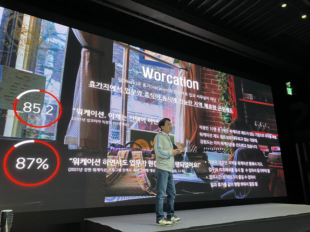 이날 워케이션 데이에 참석한 김진태 강원지사는 '강원도의 숲속 & 바다 앞 사무실로 초대합니다'를 주제로 프레젠테이션을 직접 발표했다.