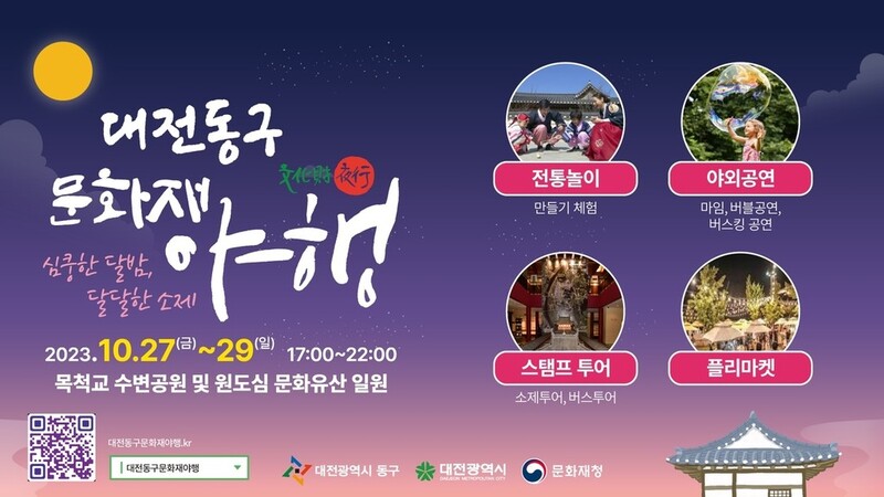 주요 프로그램인 문화해설사와 함께 소제동 달밤을 걷는 달달소제투어, 버스를 타고 야간 문화재를 탐방하는 심쿵 문화재 스탬프 투어는 홈페이지(www.대전동구문화재야행.kr)에서 미리 신청할 수 있다.