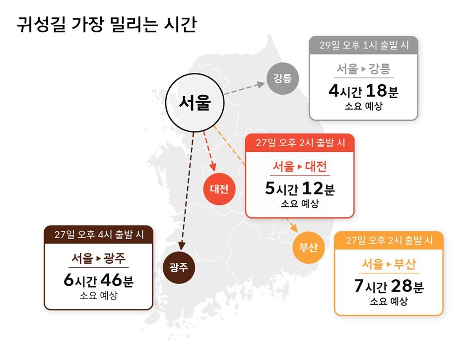 구간별로는 서울에서 29일 오전 2시께 출발할 경우 광주까지 3시간 안팎이 소요되고, 부산까지는 4시간 30분 내외가 걸릴 것으로 예상됐다.