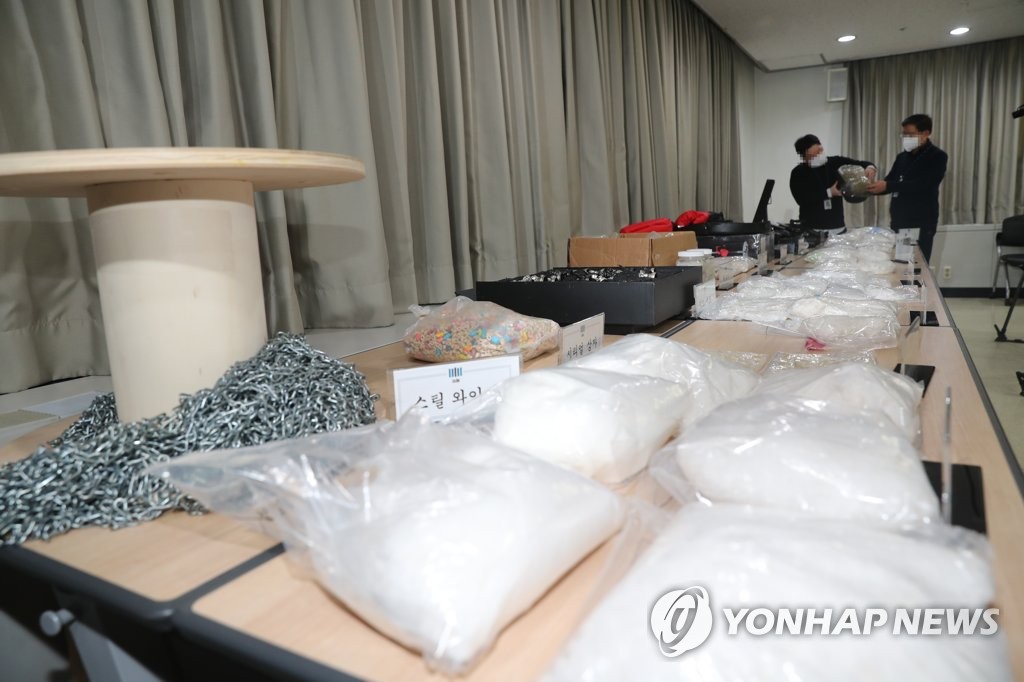 | ▲ This file photo taken Jan. 12, 2023, shows drugs, confiscated by authorities, displayed at a prosecutors office in Incheon, 27 kilometers west of Seoul. (Yonhap) |