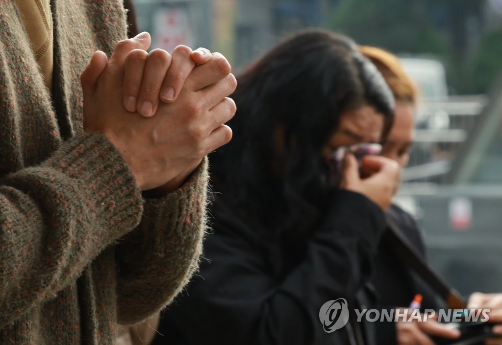 | ▲ 슬픔을 함께 (서울=연합뉴스) 홍해인 기자 = 1일 서울 용산구 이태원역 1번 출구 앞 참사 추모 공간에서 시민들이 희생자들을 추모하며 기도하고 있다. 2022.11.1 hihong@yna.co.kr |