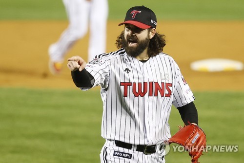 | ▲ In this file photo from Nov. 2, 2020, Casey Kelly of the LG Twins celebrates the completion of the top of the fourth inning against the Kiwoom Heroes in the Wild Card game of the Korea Baseball Organization postseason at Jamsil Baseball Stadium in Seoul. (Yonhap) |